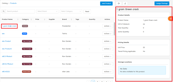 - Clicking a Product Name opens a Side Panel showing: