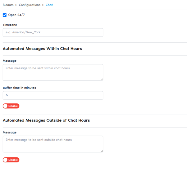 - Choose whether chat is open 24/7 or configure day-by-day hours