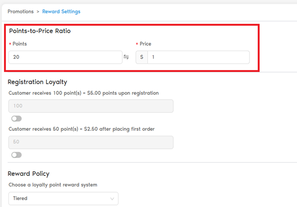 Example: 20 points = $1.The points-to-price ratio defines how many loyalty points equal one dollar in value, and this ratio powers all loyalty-related discounts and redemptions across the platform.